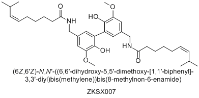 | Chemical Name: | (6Z,6’Z)-N,N’-((6,6’-dihydroxy-5,5’-dimethoxy-[1,1’-biphenyl]-3,3’-diyl)bis(methylene))bis(8-methylnon-6-enamide) |